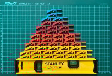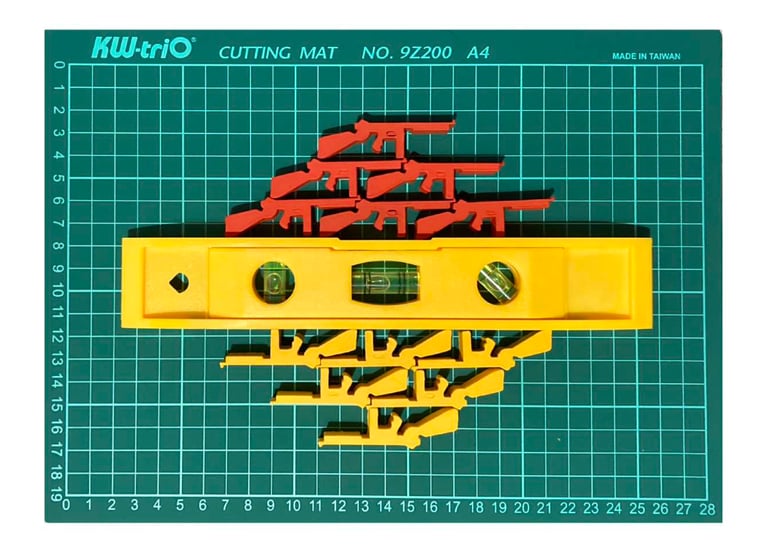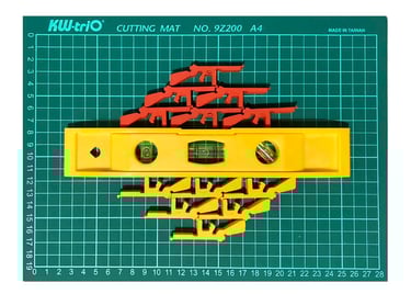 Ensamble. Nivel, piezas en madera, pintura acrílica, tabla salva corte.