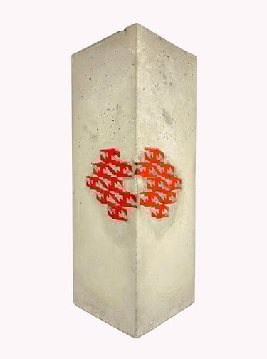 Cemento, piezas en madera incrustadas, pintura acrílica.