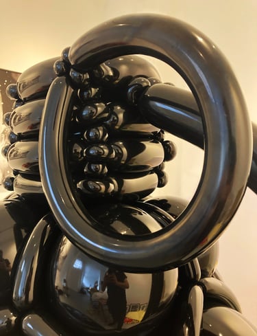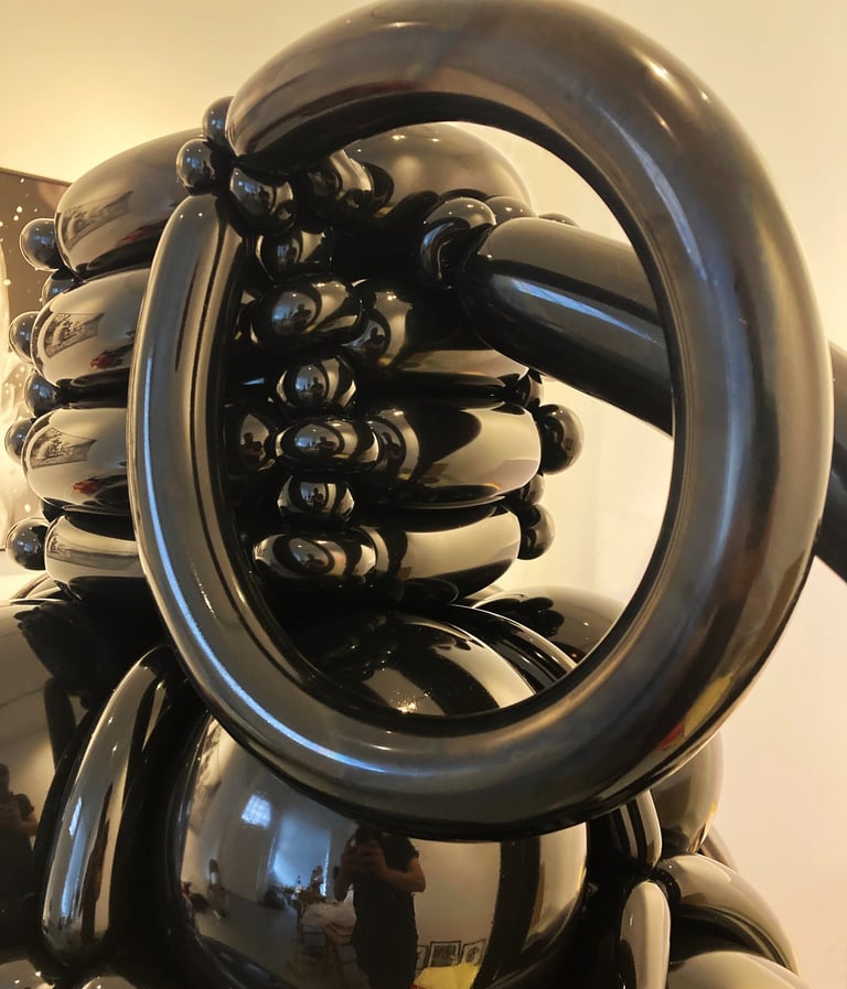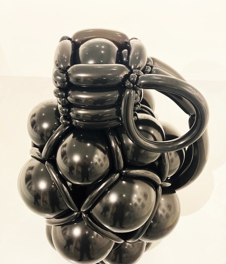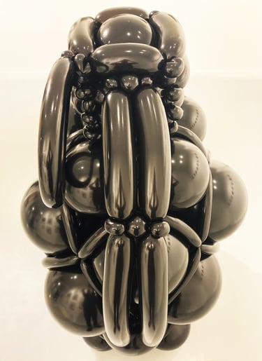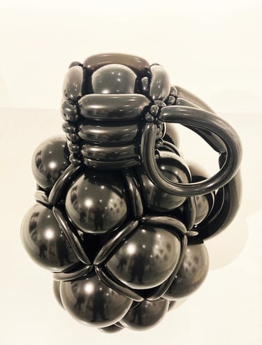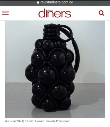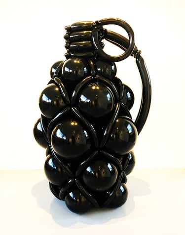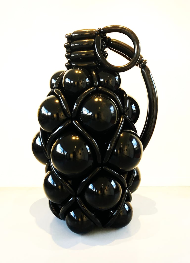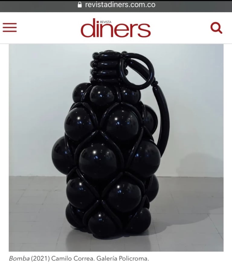En esta obra utilizo globos decorativos, conocidos en algunos países como “bomba”, para crear una granada, estableciendo una metáfora entre la alegría infantil y la violencia adulta. La palabra “bomba” evoca fiesta en los niños y terror en los adultos, reflejando cómo el juego de la niñez puede desembocar en actitudes violentas en la adultez. La efimeridad de los globos simboliza la fugacidad de la violencia y su potencial de estallar en cualquier momento, cuestionando las percepciones de violencia en la sociedad.