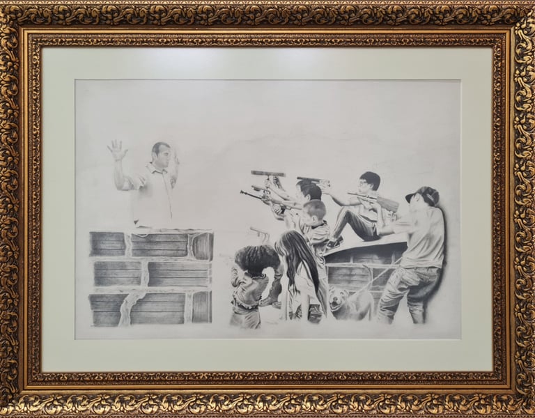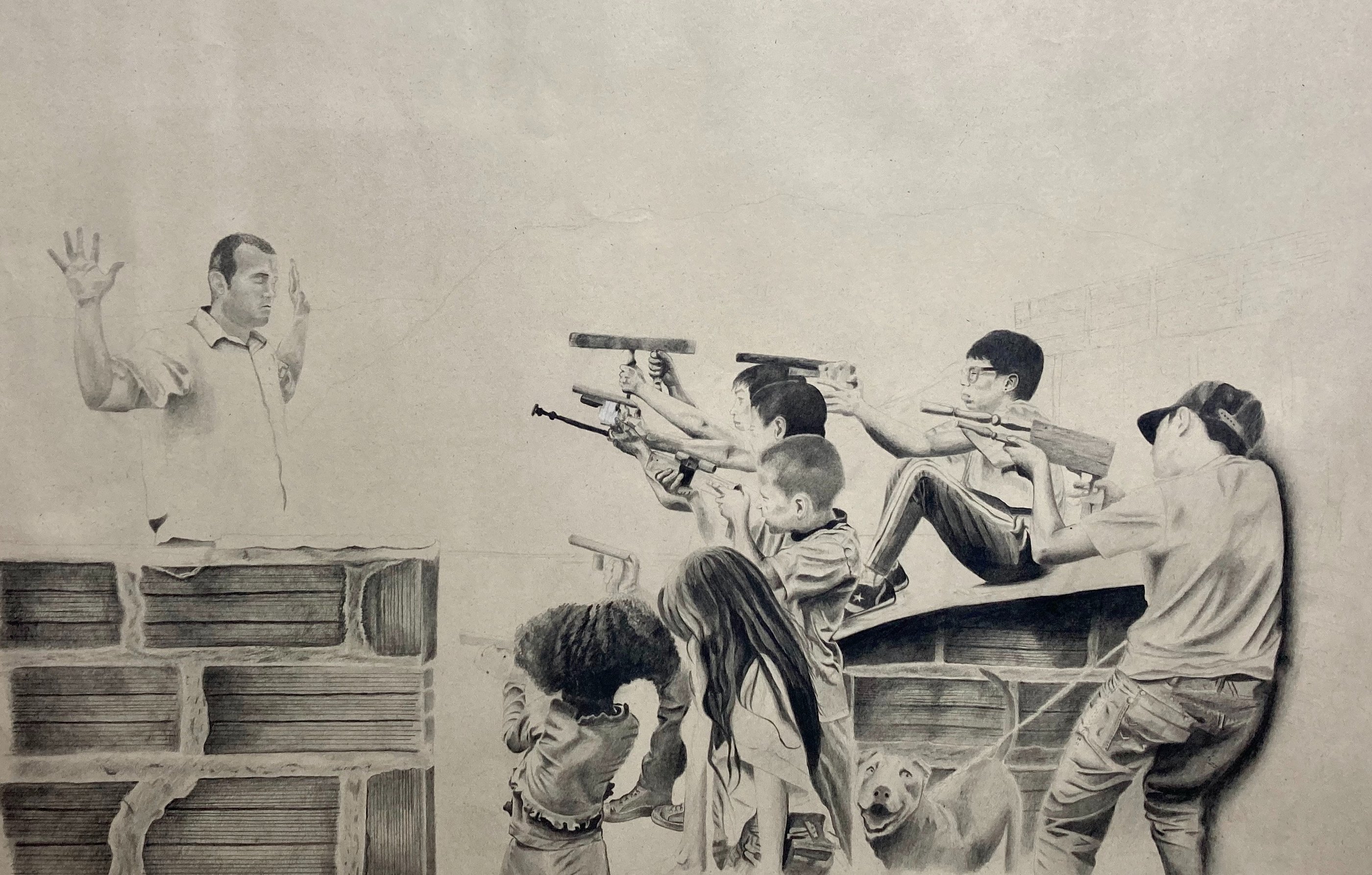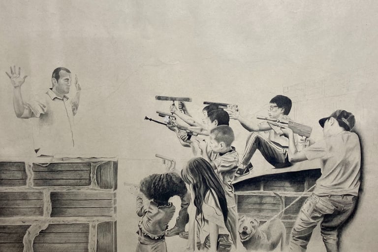 Correa lo vivió de primera mano viendo lo que ocurría a su alrededor y así lo recreó en una de sus obras. Proyectos Campo de Juego es una serie de dibujos que aluden a la famosa pintura de Goya, Los fusilamientos del 3 de mayo, donde aquí un adulto levanta los brazos en señal de indefensión mientras que un grupo de niños le apuntan con armas ficticias, que son cualquier objeto pero que ellos quieren ver como pistolas o fusiles.